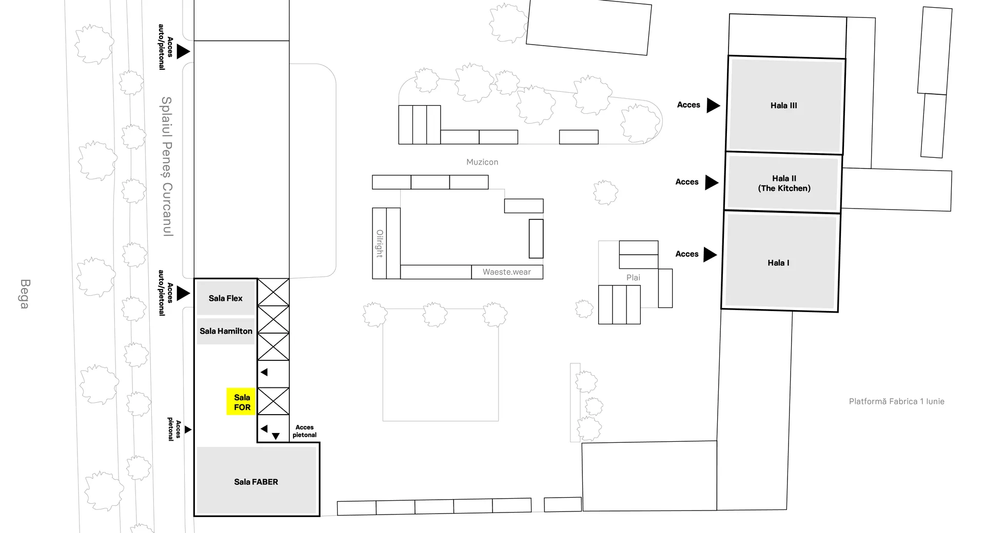Sala se află la etajul 2 intermediar, iar accesul se face pe scara metalică din curtea interioară.